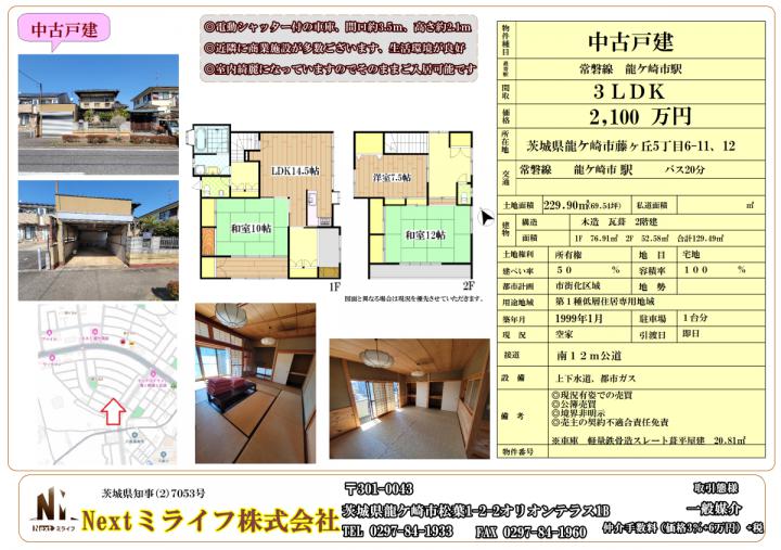 常磐線 龍ケ崎市駅 バス 20分 | 茨城県龍ケ崎市藤ケ丘5丁目6-11 | 土地/229.90㎡ 建物/129.49㎡ | 1999年01月 | 1,900万円 | 3 LDK |