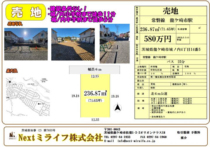 常磐線 龍ケ崎市駅 バス 25分 | 茨城県龍ケ崎市城ノ内4丁目14-5 | 土地/236.87㎡ | 580万円 |