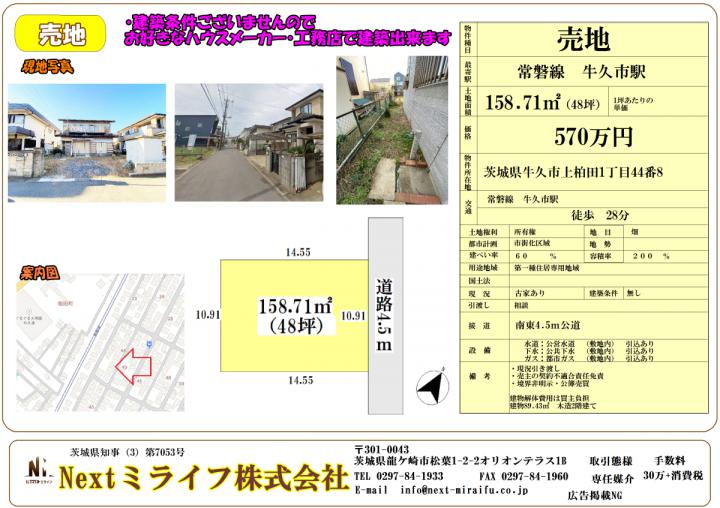 常磐線 牛久駅 徒歩 28分 | 茨城県牛久市上柏田1丁目44-8 | 土地/158.71㎡ | 570万円 |