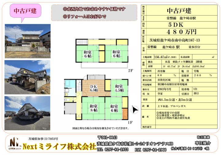 | 茨城県龍ケ崎市南中島町167-13 | 土地/156.67㎡ 建物/93.58㎡ | 1983年03月 | 480万円(税込) |